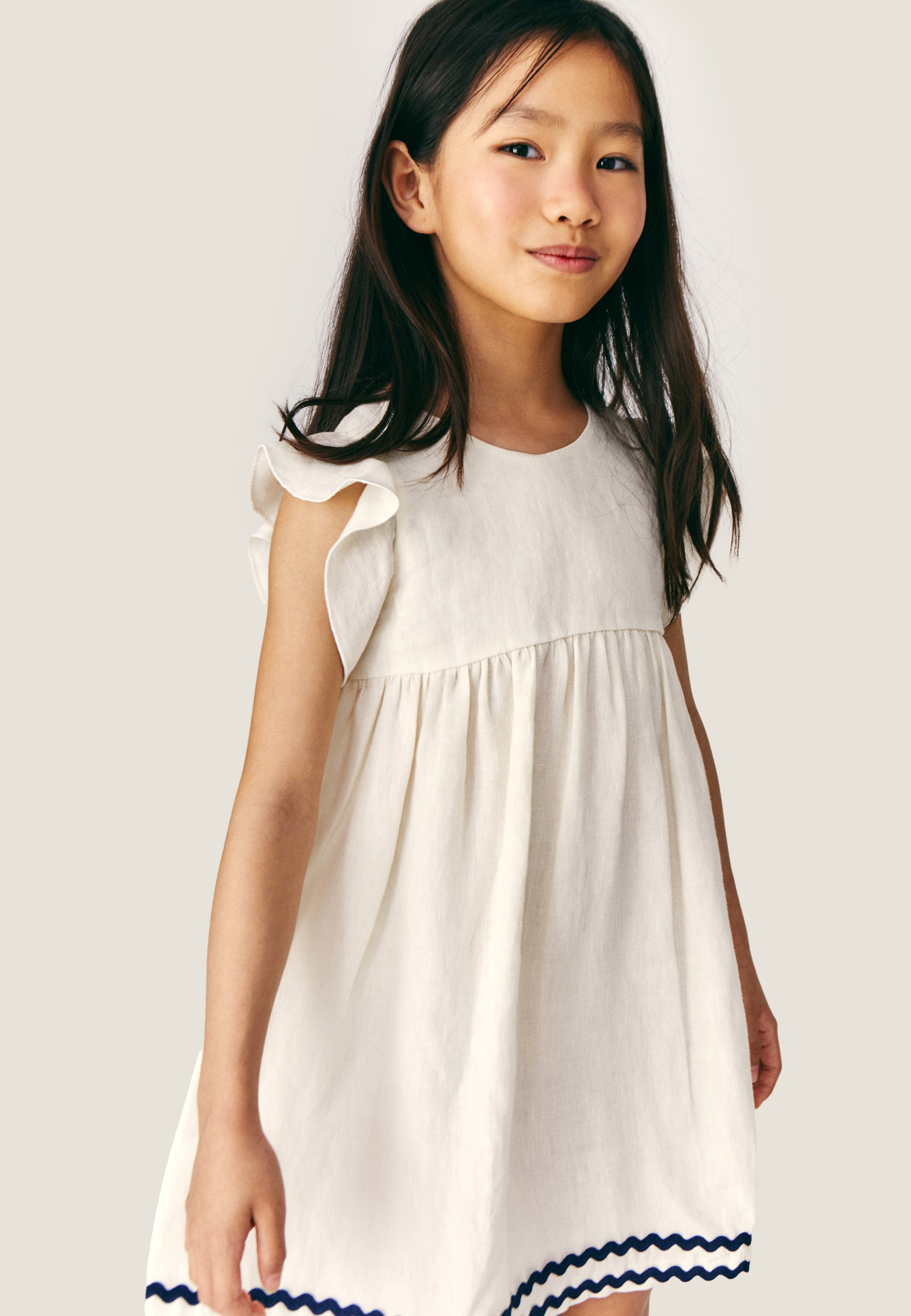 This whimsical linen dress makes styling feel ultra fun. Delicate ruffles create a natural capped sleeve, while the fluid skirt is embellished with a wavy ribbon trim. A MIPOUNET logo label completes the piece.