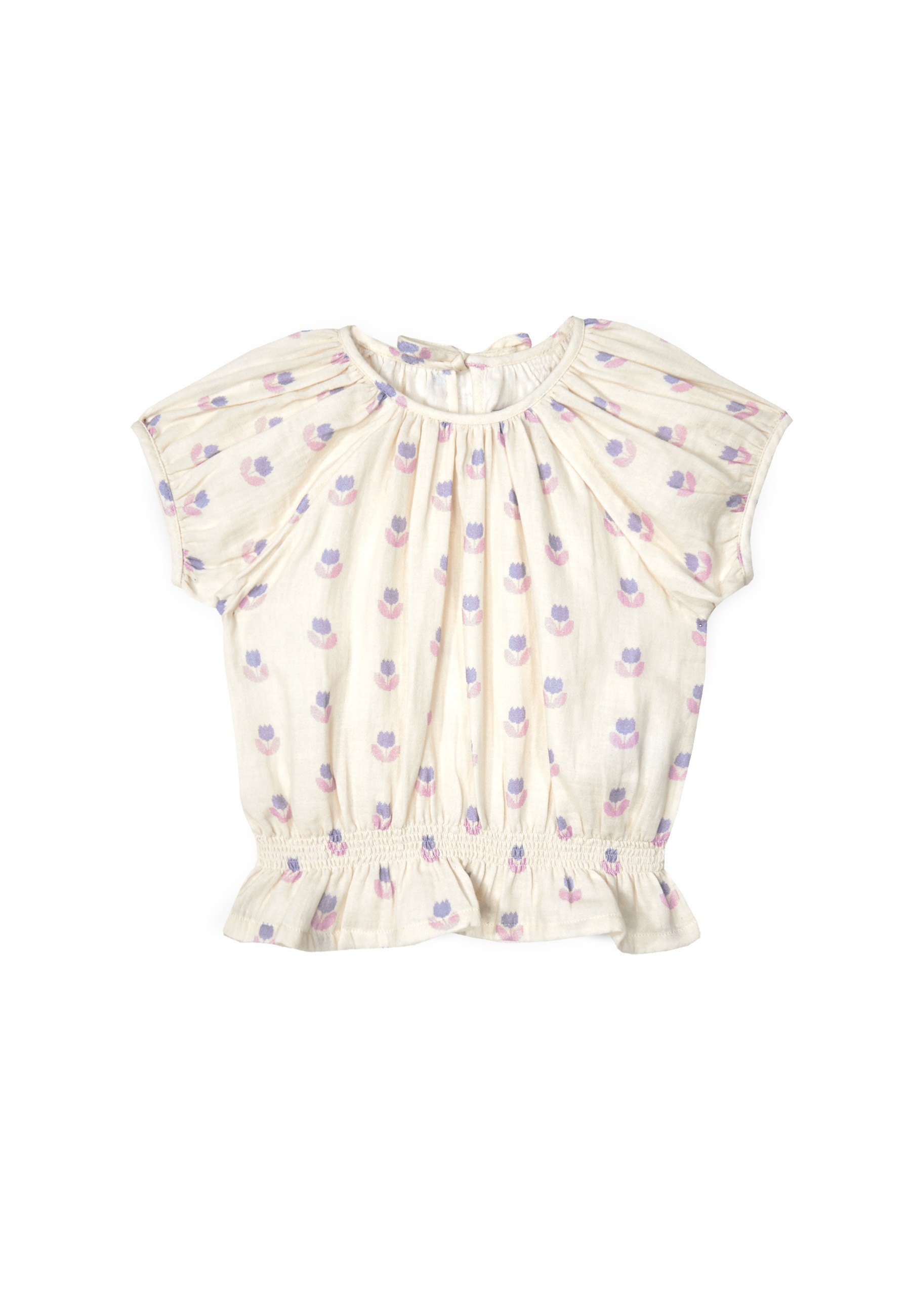 Flowers equal happiness in our book. This lightweight cotton muslin top plays with billowing shapes and is defined by an allover tulip block print designed by our very own artists. - Crewneck - Capped raglan sleeves - Gathered bodice - Shirred waist - Self-tie ribbon closure