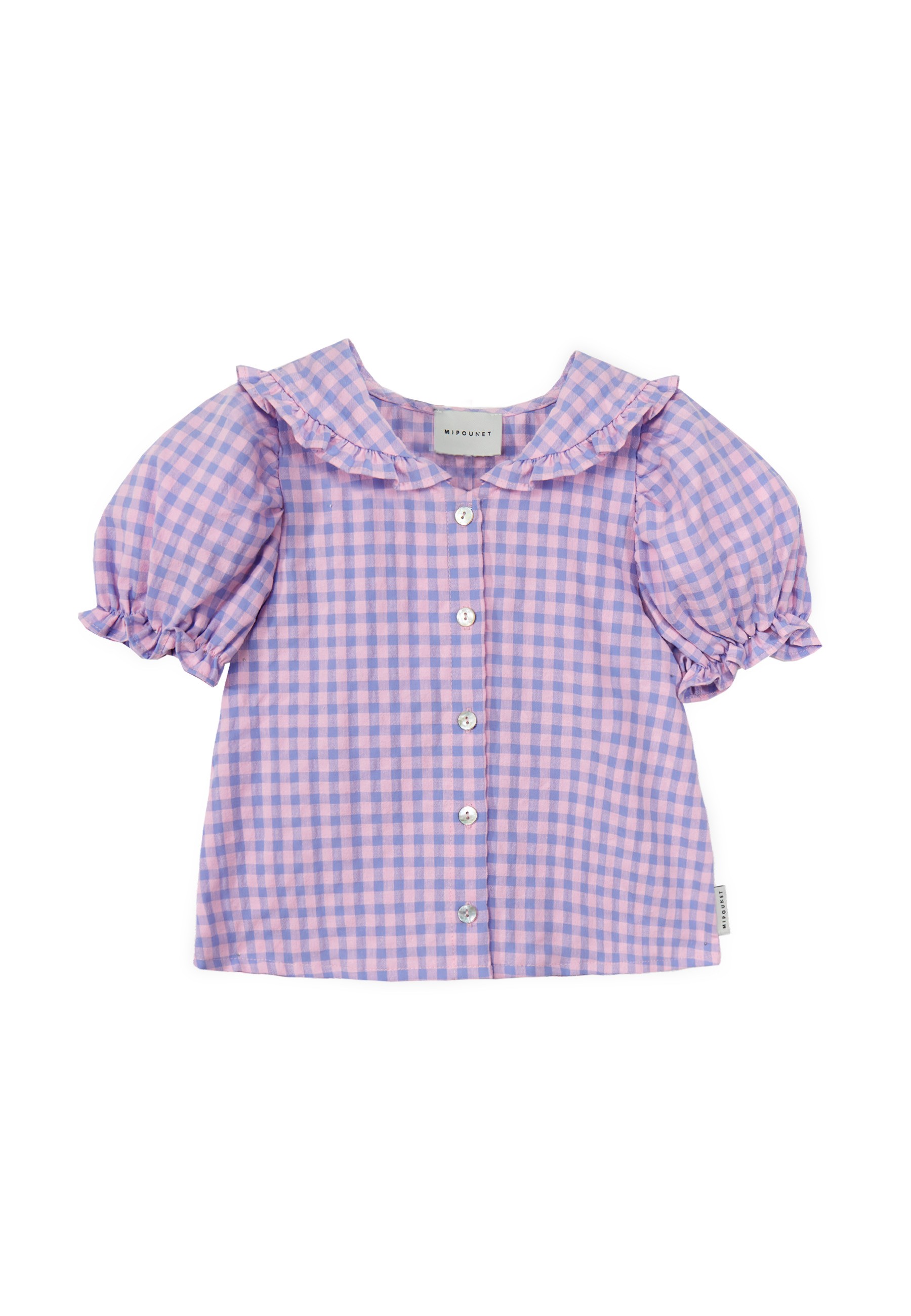 Presented in a custom-dyed gingham, the Olie blouse truly packs a punch. The straight cut is complemented by a rounded collar, puff sleeves and a fluid ruffle trim. - Peter Pan collar - Short puff sleeves - Frill detail - Shirred cuffs - MIPOUNET logo label - Button closure