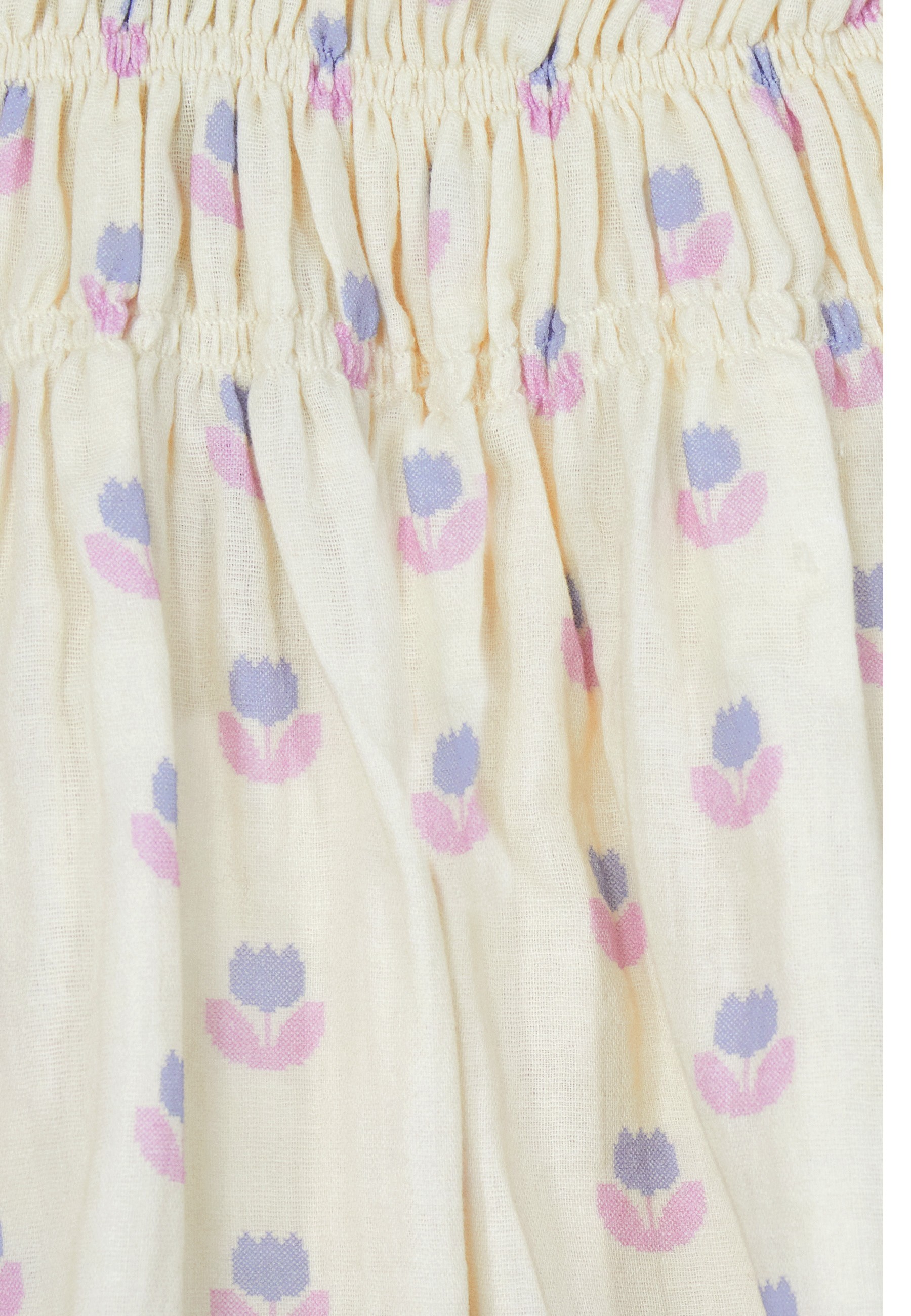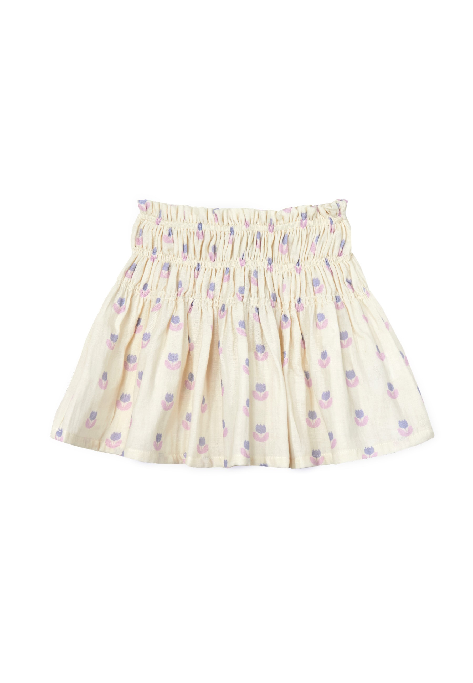 Flared mini skirts are the key to modern street style. Stated in an organic cotton muslin, this one reveals a tulip block print designed by our in-house artists. - Elastic waist - Shirred detail - Flared skirt