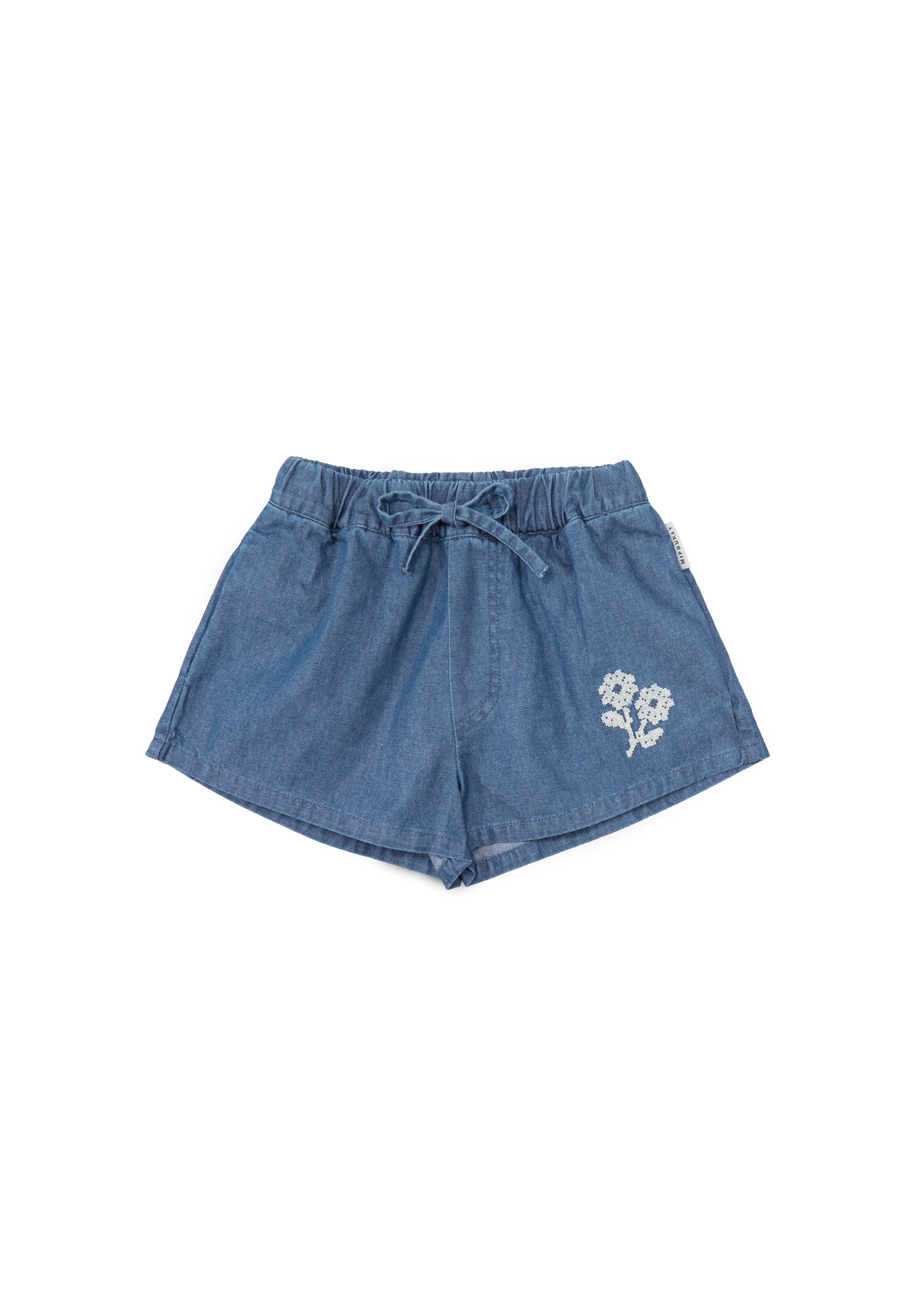These denim shorts explore a feminine shape with soft gathers and an elasticated waist. A defined floral embroidery completes the piece.