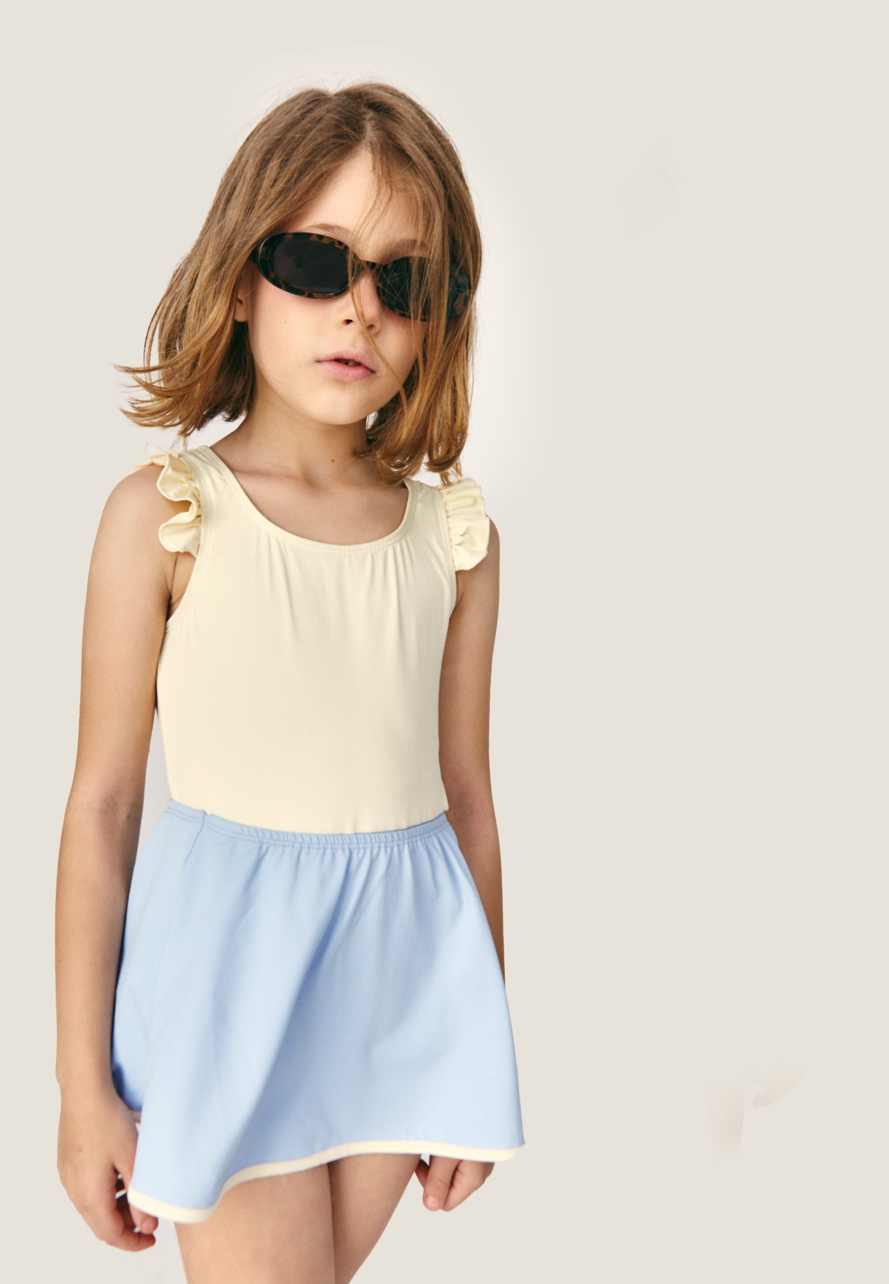 This wear-anywhere one-piece is set to carry them through summer and beyond. The two-tone construction reveals oversized ruffles, bringing movement and drama to every splash. - Scoop neck - Sleeveless - Frill trim