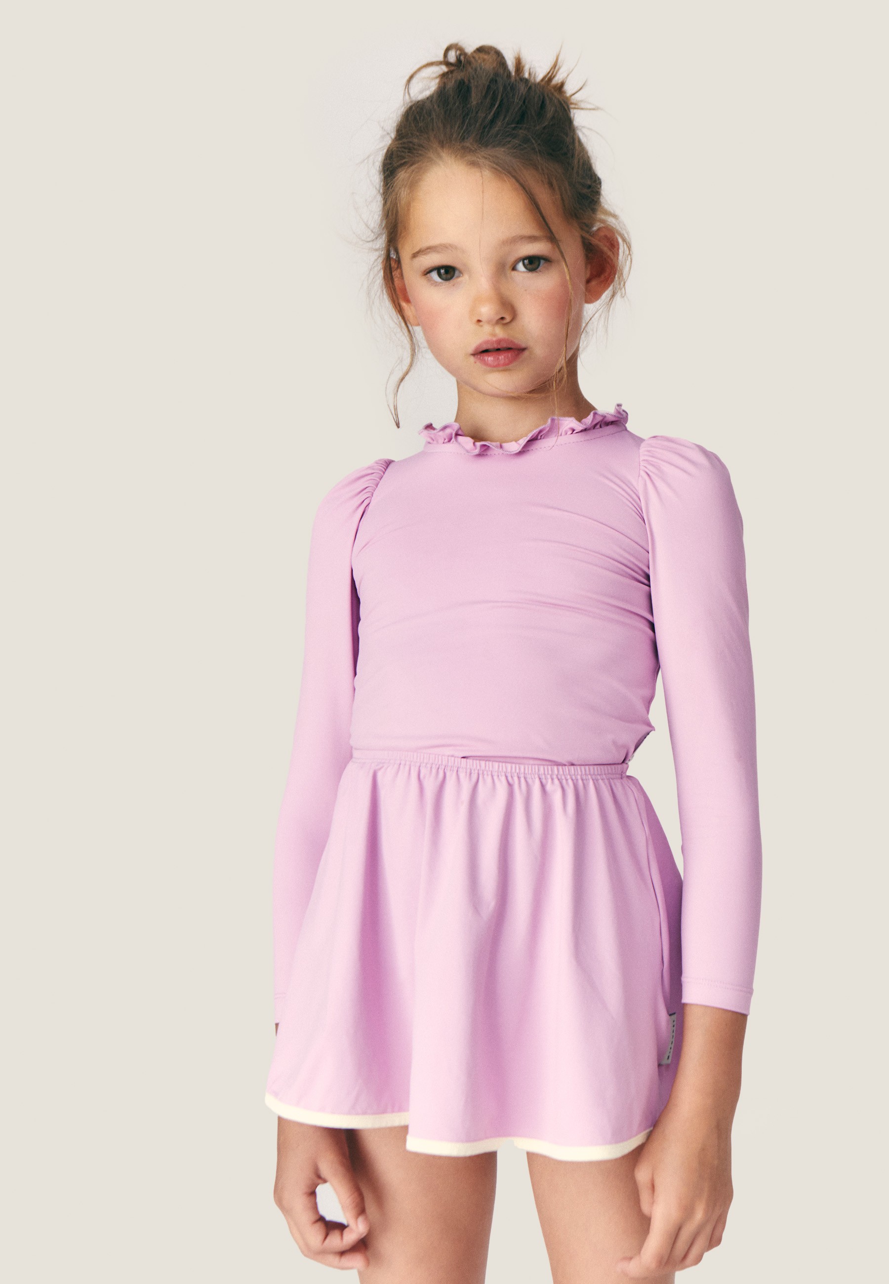 This two-piece swim set is sure to see you through many years of beach trips to come. The high-necked ruffle top keeps them protected from the sun's rays, while the tonal slip makes swimming ultra comfortable. - Ruffle stand collar - Long puff sleeves - Elastic hem - Bikini brief - Ruffle trim