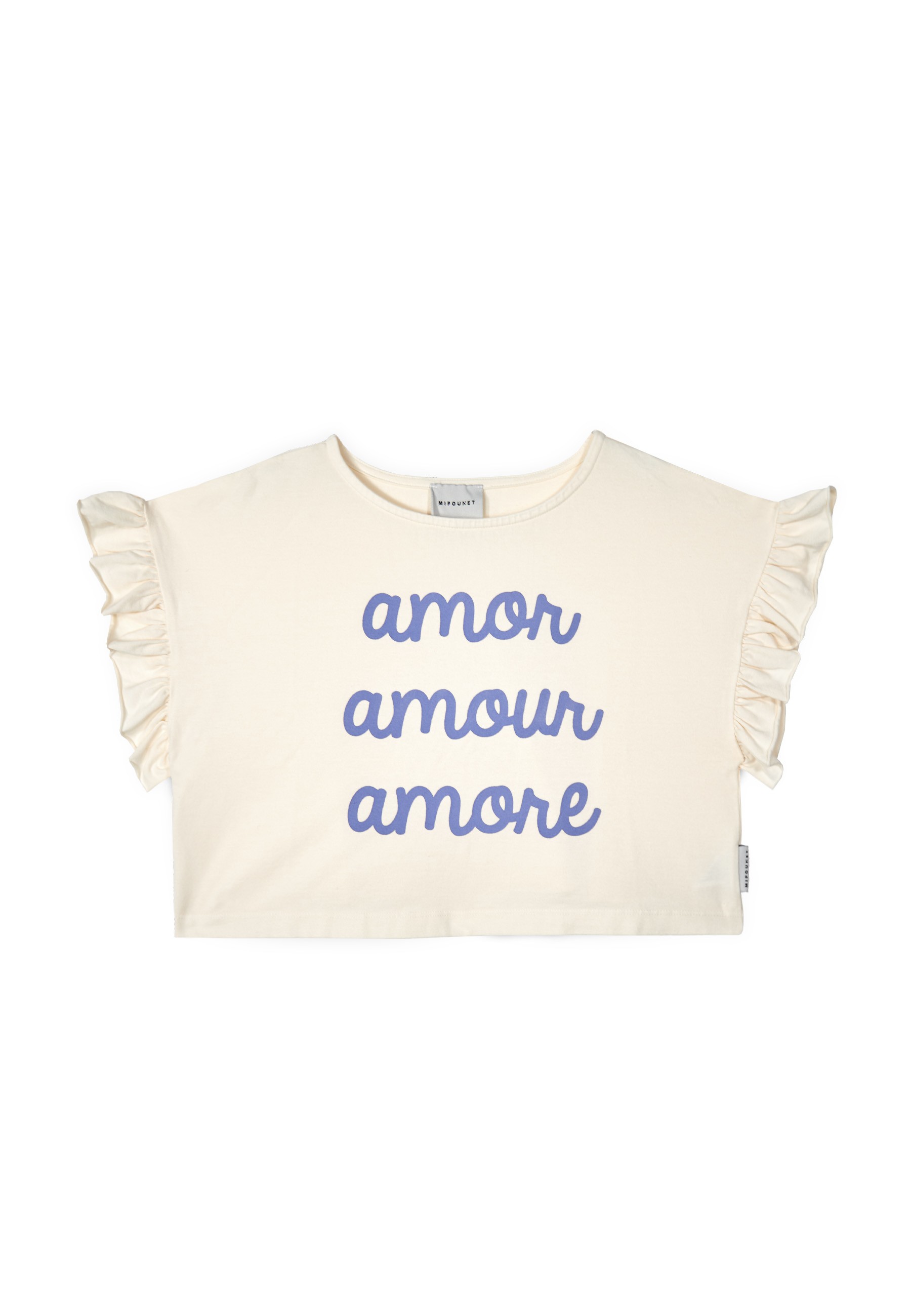 All you need is love. This cropped T-shirt is defined by an 'Amor Amour Amore' cursive print and fluid ruffles across the shoulders. - Crewneck - Dropped shoulder - Cropped length - Frill trim - 'Amor Amour Amore' print - MIPOUNET logo label