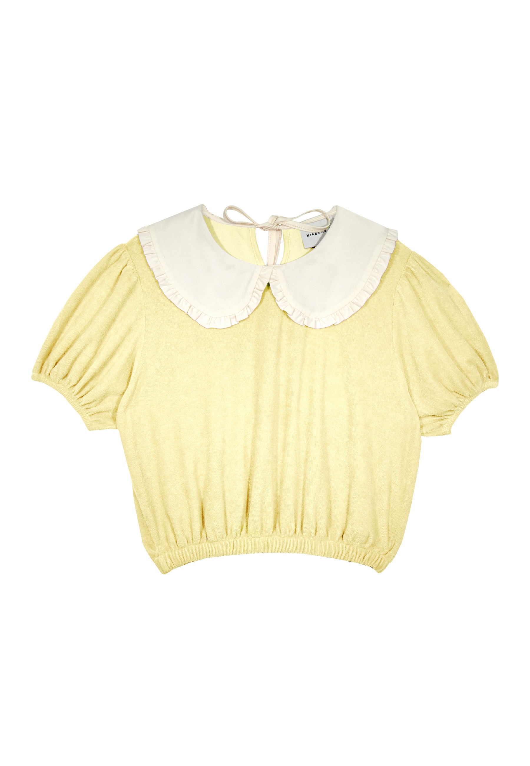 Effortless co-ords make dressing easy. The Carina T-shirt is presented in a textured cotton terry fabric, revealing an oversized collar with a frill trim. A delicate ribbon tie completes the silhouette. - Contrasting Peter Pan collar - Short gathered sleeves - Elastic hem - Frill trim - Self-tie ribbon closure